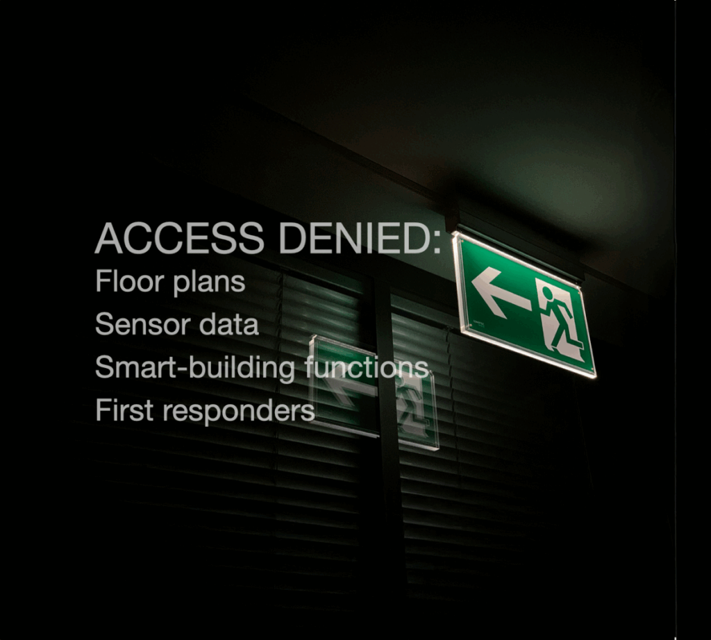 The ADA analogy is simple: building sensors and systems that “speak” is a life-safety necessity. Fire departments require even basic building data to locate stranded occupants, avoid hazards, and understand structural risks without relying on guesswork. A perfect digital twin is not what they need. The pertinent information they need should be accessible. Start with the minimum. One current floor plan per level. A dot for every shutoff and hazard. Make that visible to responders by default.”