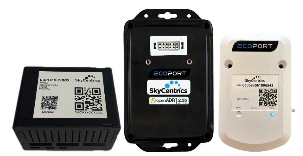 The cellular Super SkyBox connects to legacy commercial building machines (Modbus, BACNet) to become the data pipe for the applications described in this article. The SkyBox (in the middle) allows commercial building machines (Modbus, BACnet) to be OpenADR and CTA-2045 EcoPort certified for Grid-Incentives, and EcoPort modules can provide instant communication for Grid-Services such as Demand Response or Real-Time Price Response