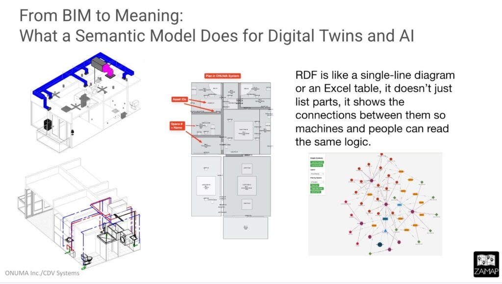 We’re not here to replace any standard; we’re here to show how they can all connect. Alongside pioneers like buildingSMART and the BIM standards of IFC and COBie, we’re bringing in ASHRAE’s 223P, Brick Schema, Project Haystack, RealEstateCore, and the Semantic Building Group from the Coalition for Smarter Buildings. We’re also aligning with the Open Geospatial Consortium to bridge GIS and BIM. And we’re challenging the limitations of file-based BIM with cloudBIM, because the BIM world is evolving toward cloud-native, continuous data, not static files frozen in time.