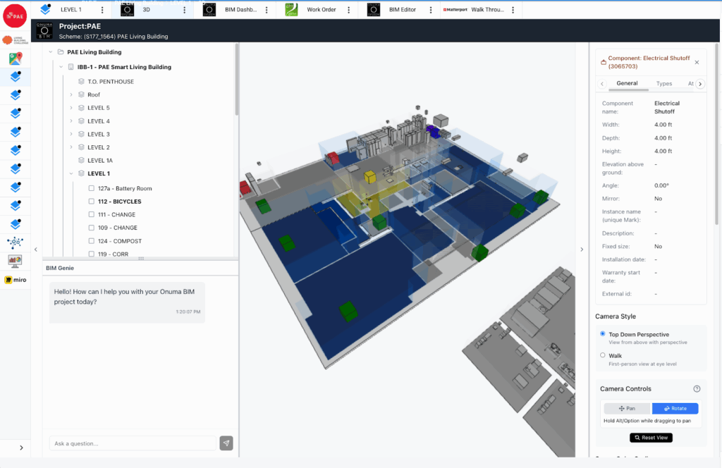 One example comes directly from the PAE Living Building itself. When the building’s battery charge drops below 15%, that single data signal from SkyCentrics now triggers a workflow through BIMgenie, automatically creating a digital work order that alerts the technician responsible for the energy system. Instead of waiting for someone to notice, the building detects the condition and initiates the response. It’s a simple but powerful use case: turning a live signal into intelligent action. This is how a digital twin evolves, from one data point at a time, expanding as new use cases are identified.