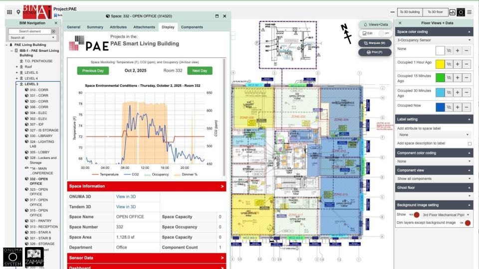 The PAE Living Building: Is Alive! With the help of PAE, C4SB, Linux Foundation, Asset Leadership Network, Onuma System, SkyCentrics, and more. Image of live sensor data flowing from PAE Systems through SkyCentrics and into the cloudBIM.
