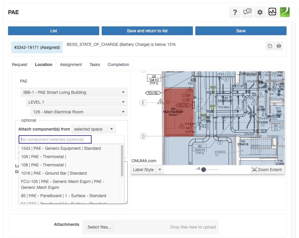 One example comes directly from the building itself. When its battery charge drops below 15%, that single signal from SkyCentrics triggers a workflow through BIMgenie, automatically creating a digital work order and alerting the technician responsible. The building doesn’t wait to be checked, it recognizes a need and acts.