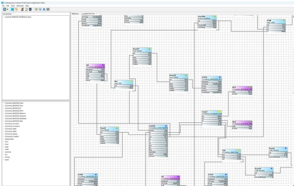 Next, Barrantes implemented BAScontrol-E36 which features 36 universal I/O points and supports BACnet/IP and BACnet MS/TP client/server operation. It is webpage-configurable and freely programmable using Contemporary Controls’ Sedona Application Editor (SAE) which is included in the BAScontrol Toolset—a free set of software tools to configure, test, emulate, and archive controller operation on a Windows PC.
