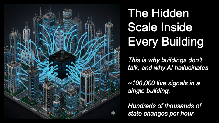 Buildings behave like cyber-physical systems, sensing, reacting, consuming energy, yet unlike robots, they hide their internal state. Their intelligence is trapped behind vendor systems, proprietary data, and fragmented workflows.