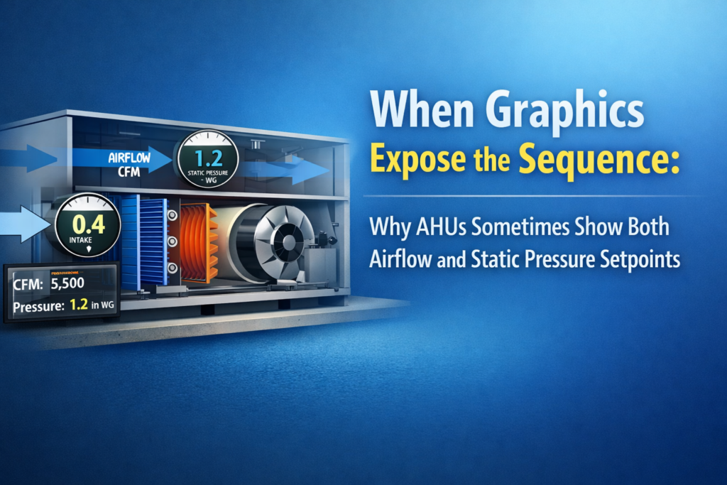 Seeing both supply airflow and static pressure setpoints on an AHU graphic is not a mistake—it is often a sign of a well-instrumented, well-documented VAV system. Static pressure typically controls the fan, while airflow supports ventilation, diagnostics, and compliance. When BAS graphics are derived directly from the sequence of operations, they transform from pictures into engineering conversations—and that is exactly where better buildings begin.