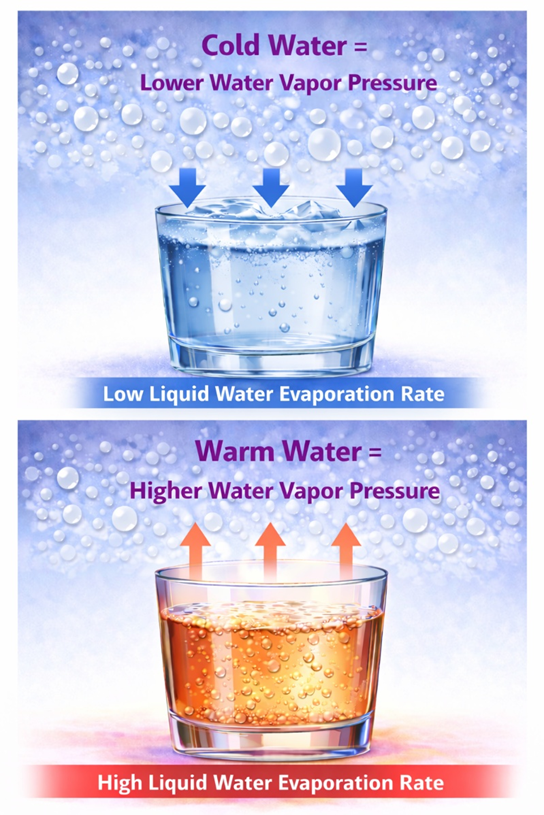The following image explains water vapor pressure in the air for equal-temperature water.