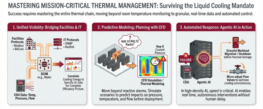 In a high-density AI environment, things happen fast. If a CDU fails, software needs to instantly identify the affected workloads and potentially trigger a graceful shutdown or migration before thermal damage occurs. “Agentic AI” in the management layer will become a critical ally, making micro-adjustments to flow valves to optimize cooling without human intervention.