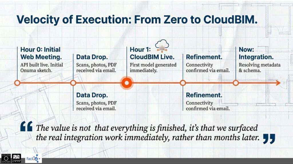 Seven days later, we had a functioning operational digital twin: geometry grounded in context, live endpoints attached to identifiable assets, and rules capable of triggering maintenance logic.